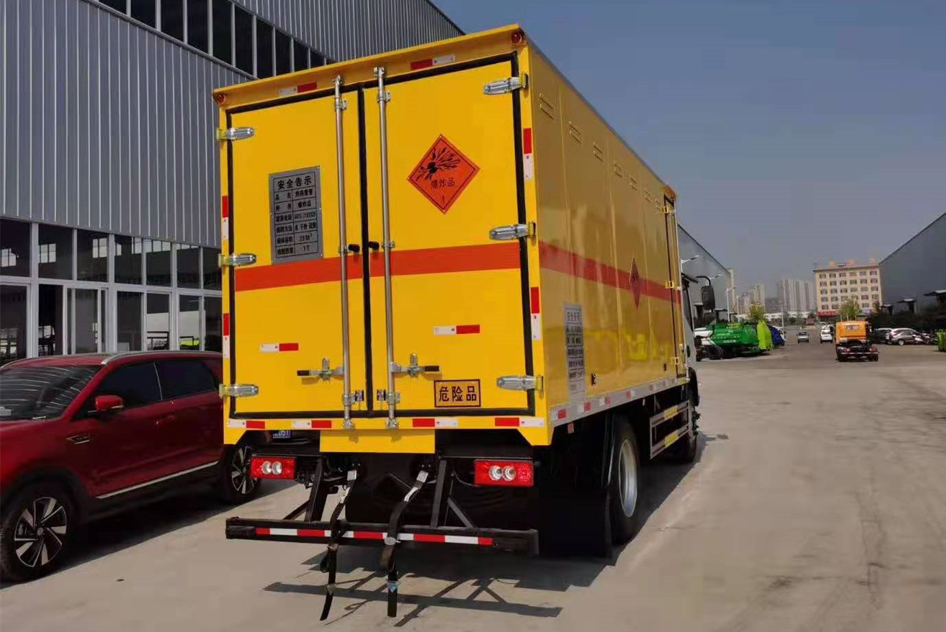 該車(chē)適用于運(yùn)輸危險(xiǎn)品,隨底盤(pán)選裝駕駛室,選裝右側(cè)不開(kāi)門(mén);危險(xiǎn)貨物運(yùn)輸車(chē)輛的類(lèi)型(EX/Ⅲ),廂體頂部封閉,不可開(kāi)啟,運(yùn)送爆炸品的品名:黑火藥,壓縮黑火藥,電(非電)引爆雷管,爆破炸藥,導(dǎo)爆索,點(diǎn)燃導(dǎo)火索;運(yùn)送爆炸品的項(xiàng)號(hào):1.1D,1.1D,1.1B,1.1D;安全裝置為導(dǎo)靜電帶,用于防止靜電;僅采用底盤(pán)子午線(xiàn)輪胎和帶ABS的底盤(pán),該車(chē)前輪安裝盤(pán)式制動(dòng)器,前置排氣管,裝配限速裝置,限速80km/h;安裝帶有衛(wèi)星定位功能的行駛記錄儀;側(cè)防護(hù)和后防護(hù)裝置材料材質(zhì)為Q23**碳鋼,側(cè)防護(hù)與箱體底板和副梁焊接連接,后防護(hù)裝置與車(chē)架采用焊接連接。后防護(hù)截面尺寸(mm):120×50,離地高度為500mm。整車(chē)長(zhǎng)度/軸距/后懸對(duì)應(yīng)關(guān)系為(mm):7030/3800/2**。僅采用發(fā)動(dòng)機(jī)F3.8NS6B156對(duì)應(yīng)的油耗值(L/**km)為:20.81。ABS系統(tǒng)**器型號(hào)/生產(chǎn)企業(yè):ABS-E/威伯科汽車(chē)**系統(tǒng)(**)有限公司,ABS-VI·E/廣州瑞立科密汽車(chē)電子股份有限公司。轉(zhuǎn)向輪裝備輪胎爆胎應(yīng)急防護(hù)裝置。隨底盤(pán)選裝駕駛室。 |
